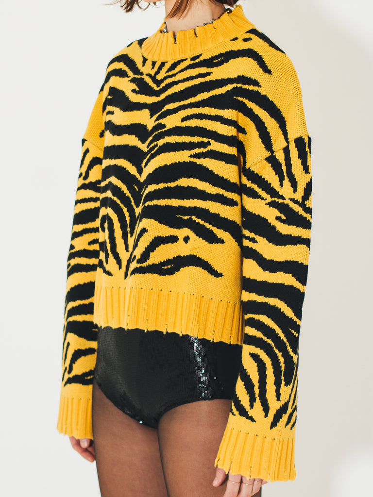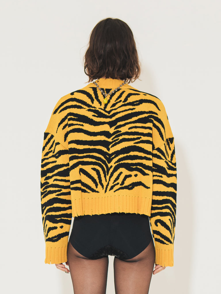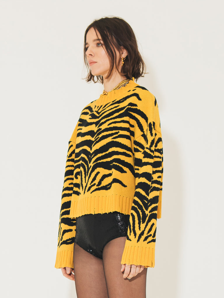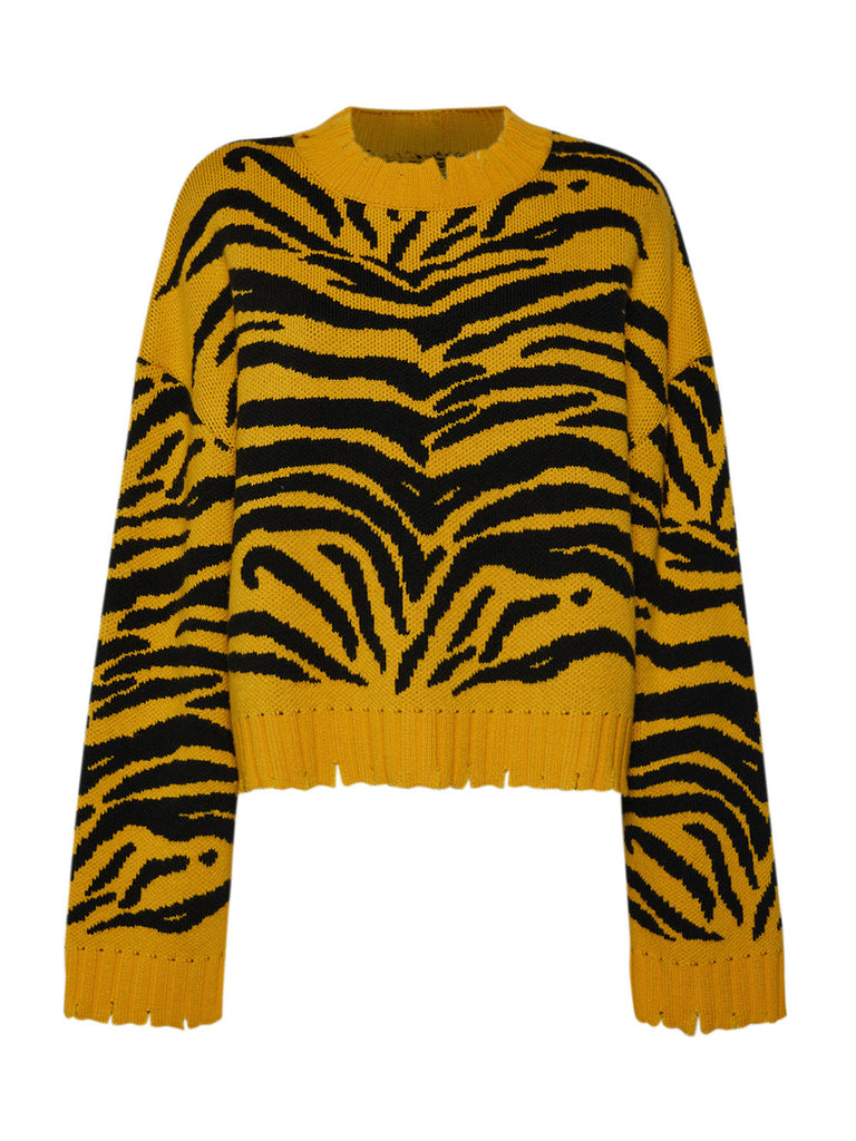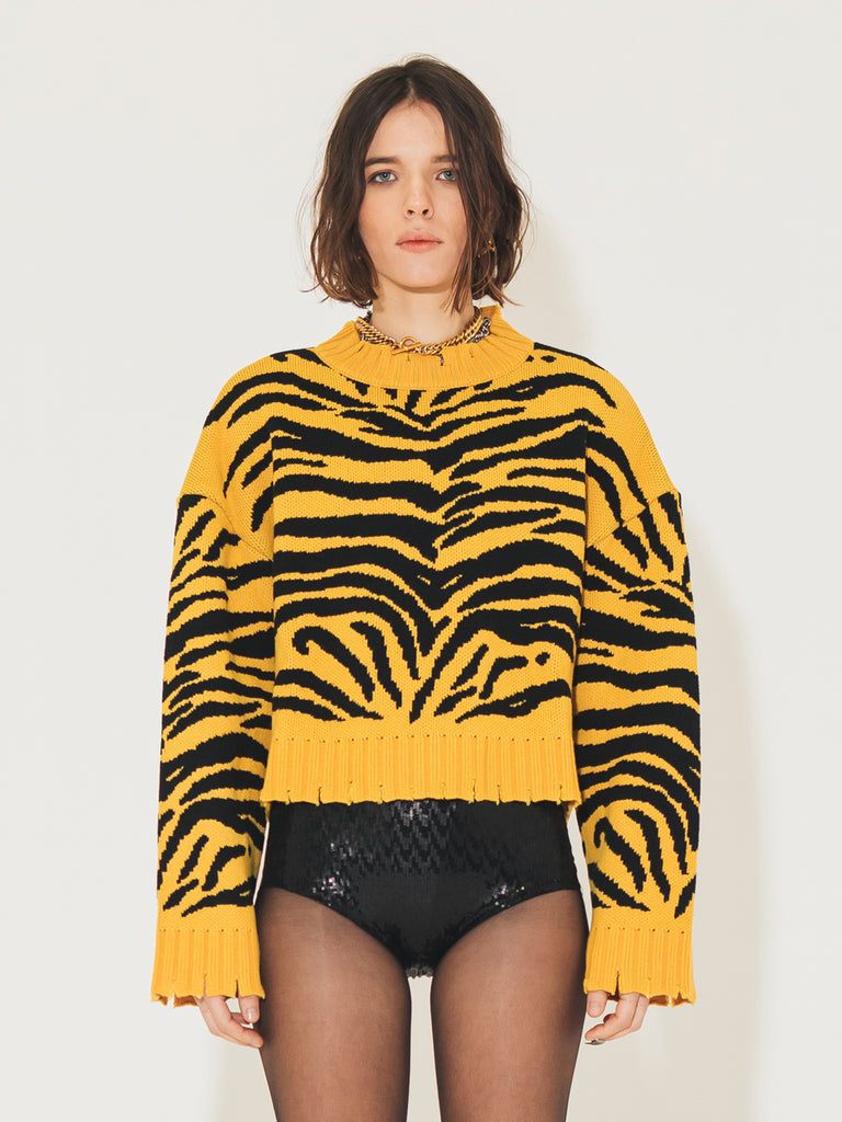 Hey girls, are you looking for a sweater that makes you feel fashionable and warm at the same time? Then the Sveta Milano crewneck sweater in a blend of merino wool with a tiger jacquard pattern is perfect for you! The rips on the crewneck and lower edges make it unique and original, perfect for those who like to dare with their outfits. The merino wool will keep you warm in any situation. And the tiger pattern will make you feel strong and confident. Don't miss the opportunity to have this must-have for the cold season!