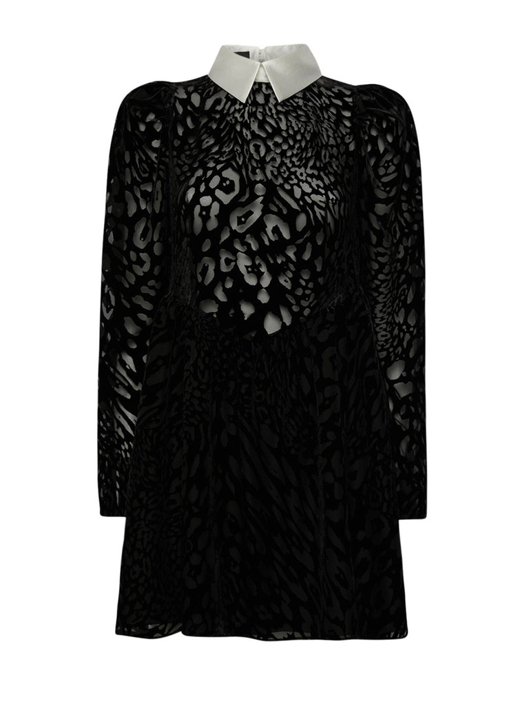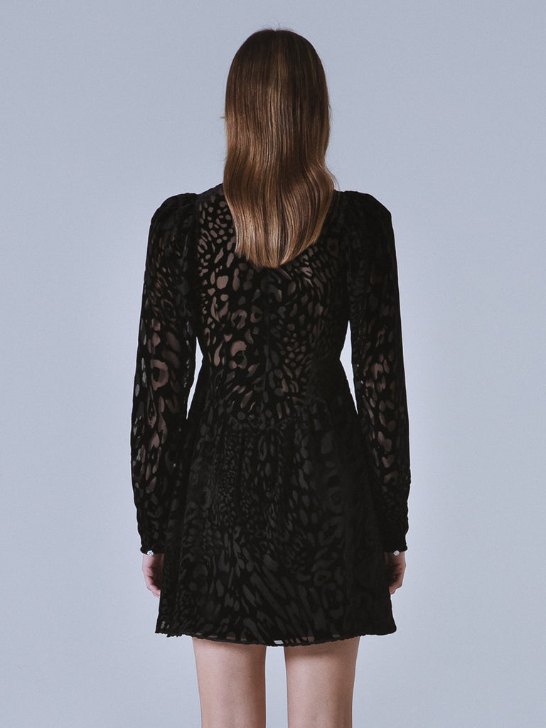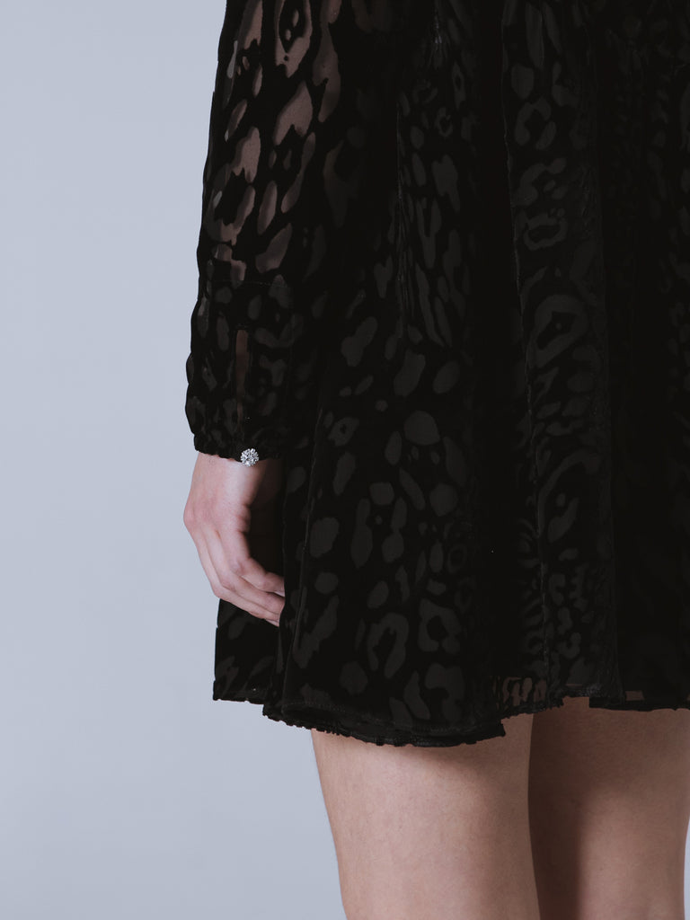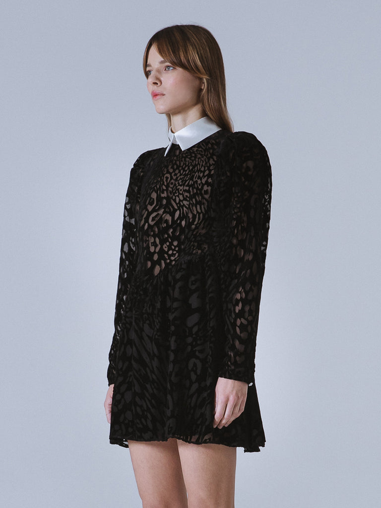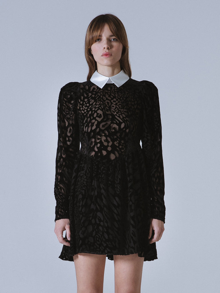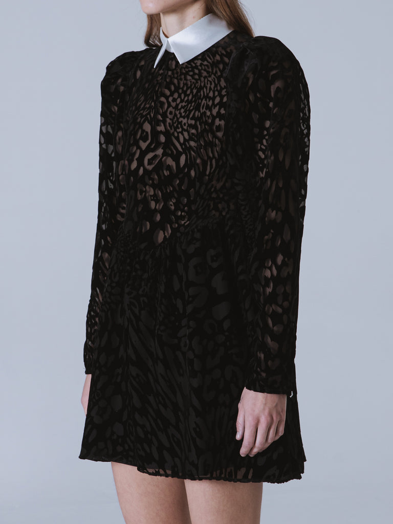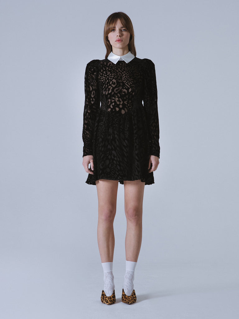 Inspired by the world of the American Ivy League, this babydoll-shaped dress is crafted from velvet in new leopard pattern and embellished with duchess silk collar and jewel buttons on the cuffs and behind the collar to give it an unparalleled bon ton allure.