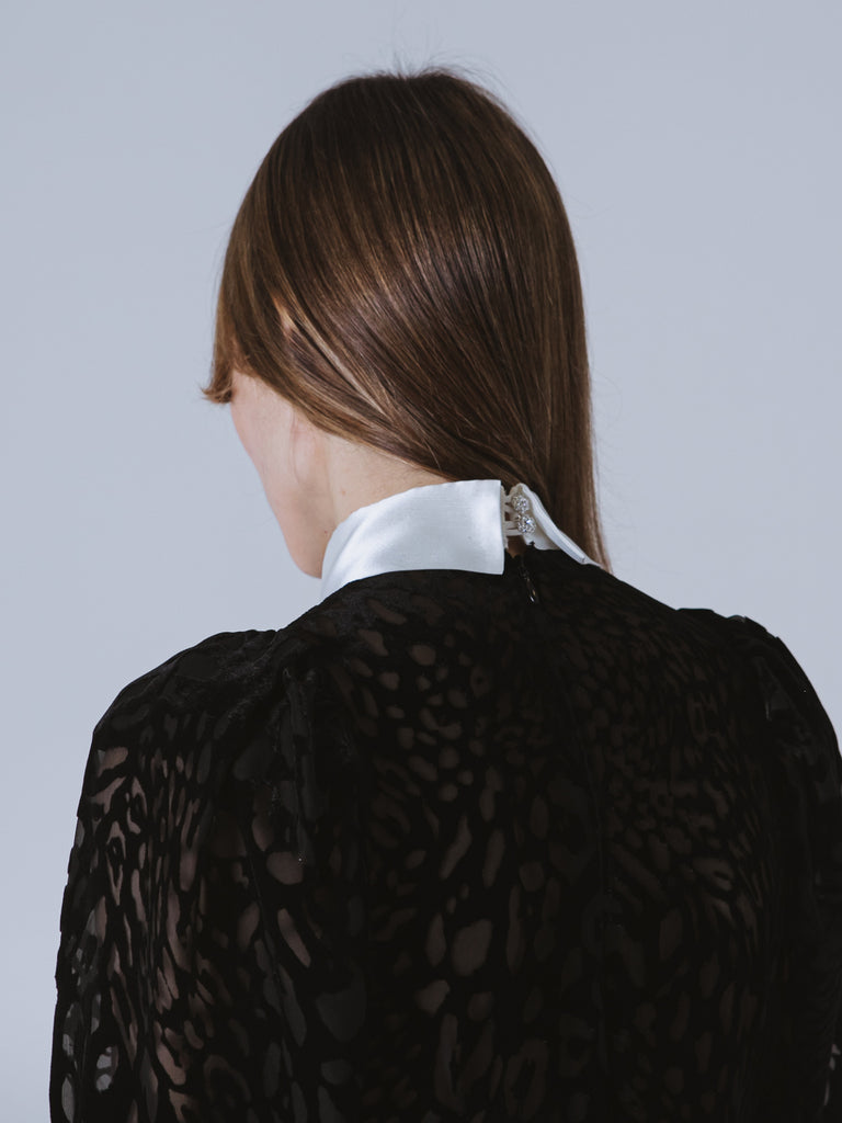 - Main material | Body: 68% viscose, 32% silk | Collar: 100% duchess silk