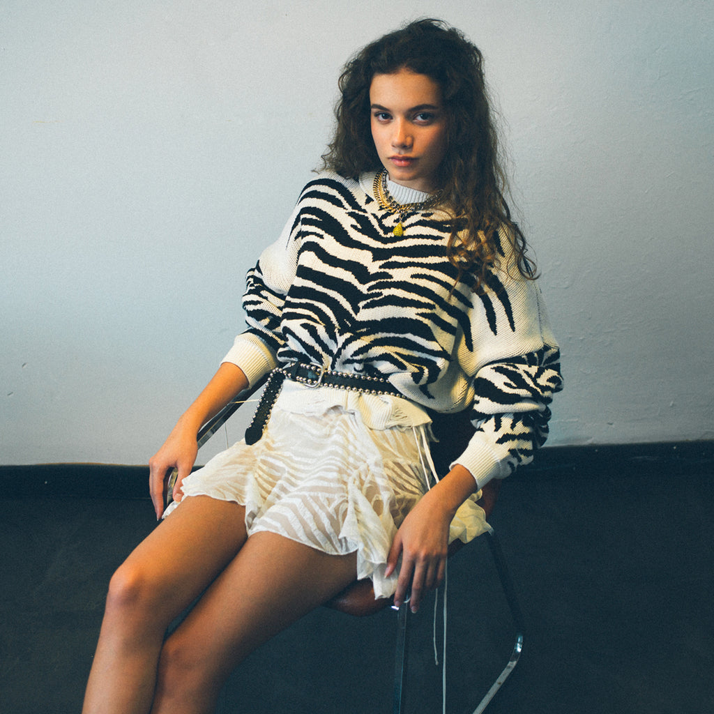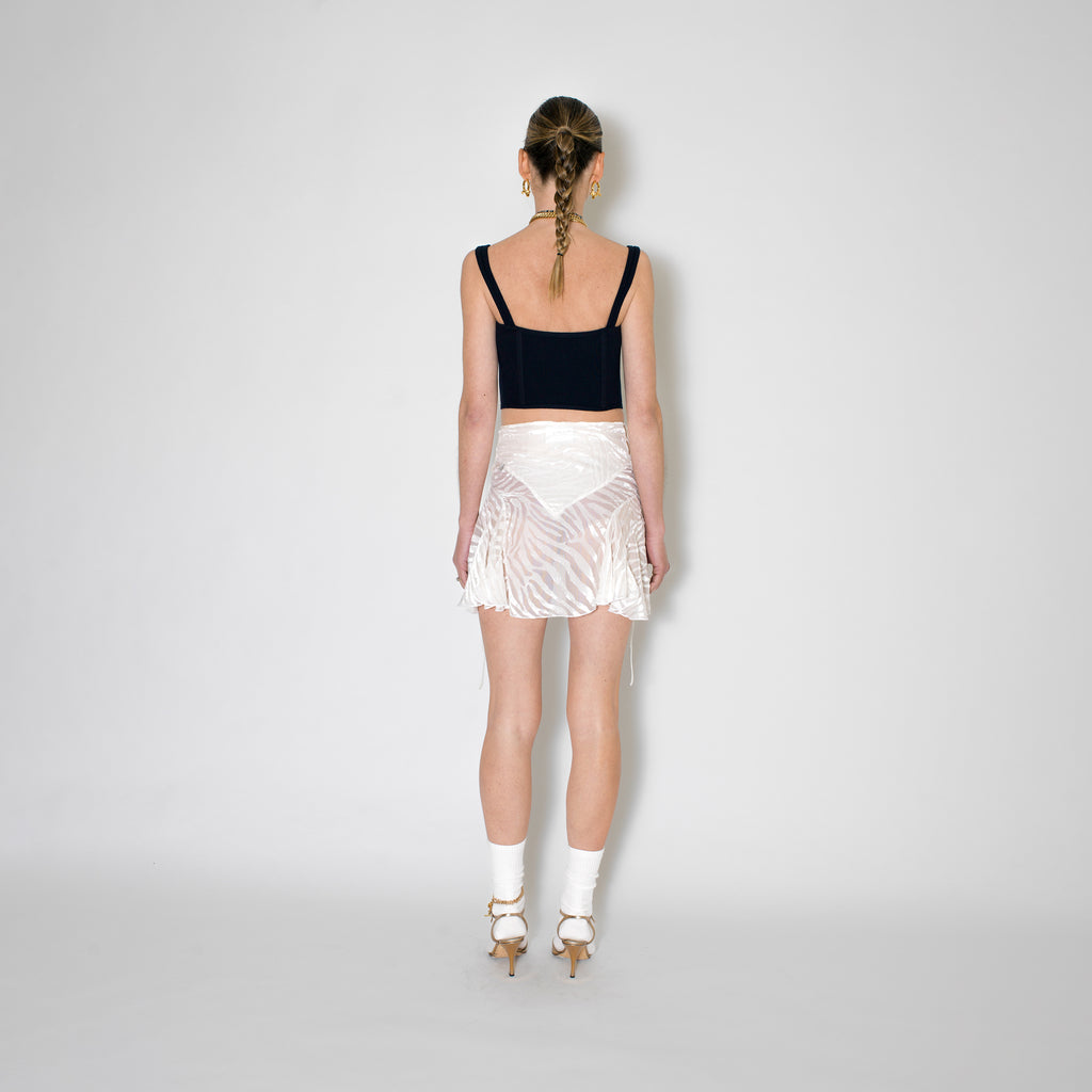 A velvet mini skirt speaks to the glamorous side of the Sveta Milano narrative. Mary silhouette features a regular waist with laces on the sides, while the inside is partially lined.