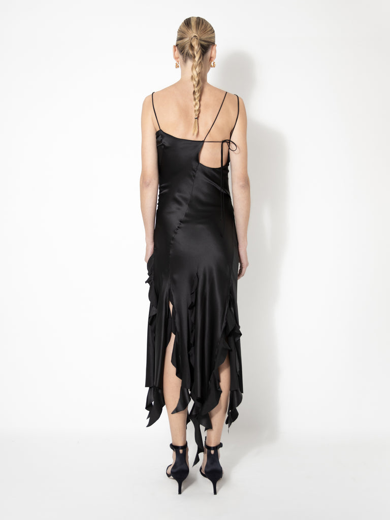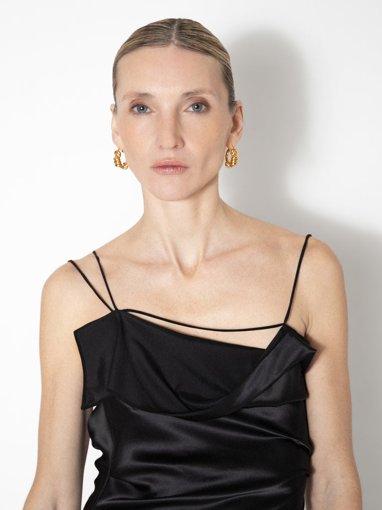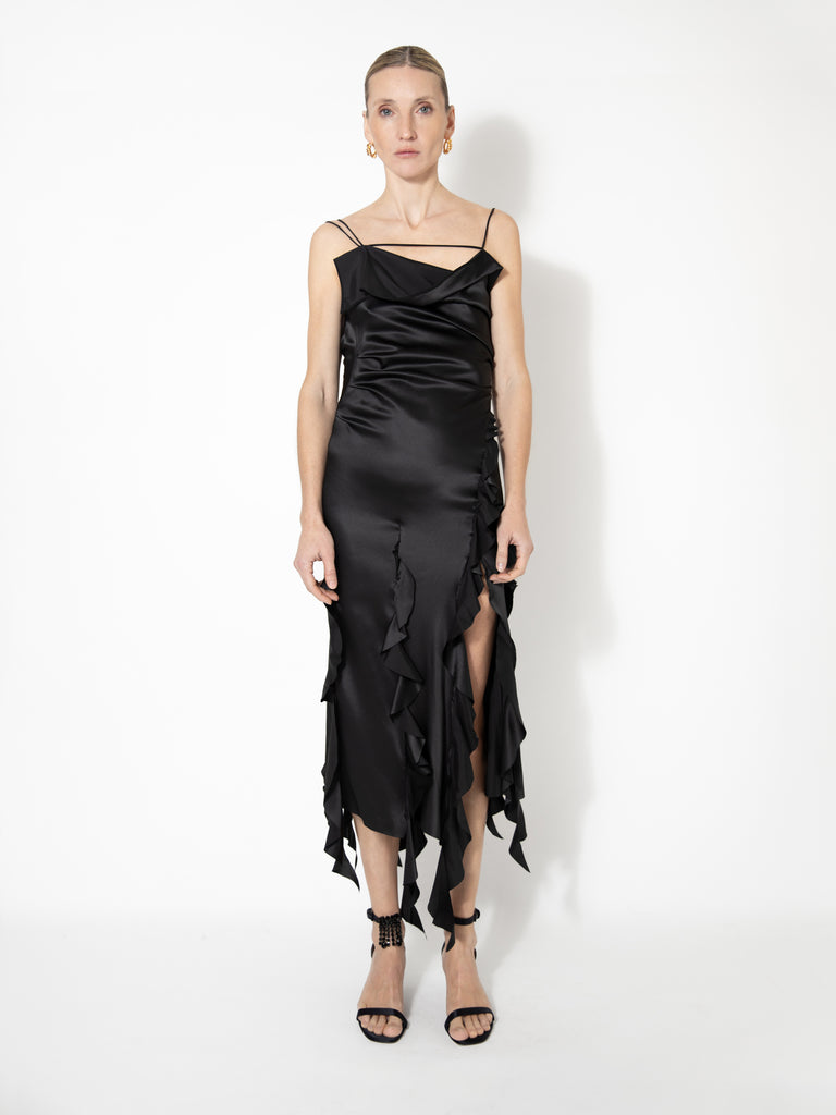 L'abito Capri eleverà il tuo fascino e la tua sensualità grazia alla forma simmetrica e allo spacco laterale. Realizzato in raso di seta lucido, si ispira all'eleganza senza tempo delle donne italiane