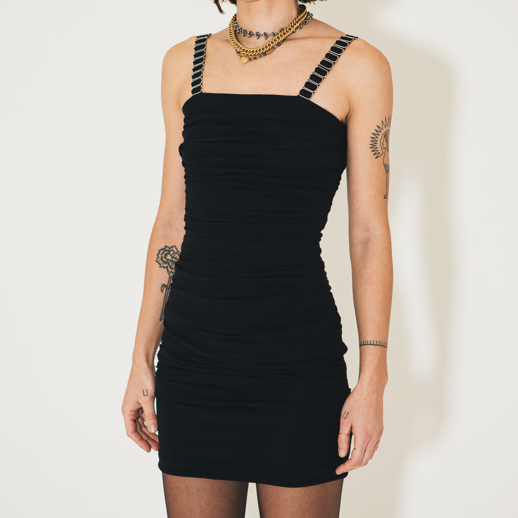 Sveta Milano trascrive creatività e innovazione attraverso le sue due collezioni, Il Giardino dei Dissidenti e Il Giardino degli Scettici Incorreggibili. Tra drappeggi e atmosfere oniriche, questo abito, realizzato in crêpe de chine di seta, rivela una silhouette sofisticata, rappresentandone perfettamente l'ambivalenza ad essa connaturata, ovvero la capacita di far comunicare mondi lontani e contrastanti.