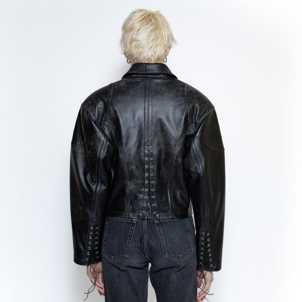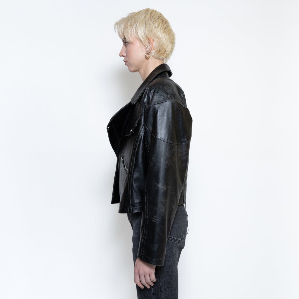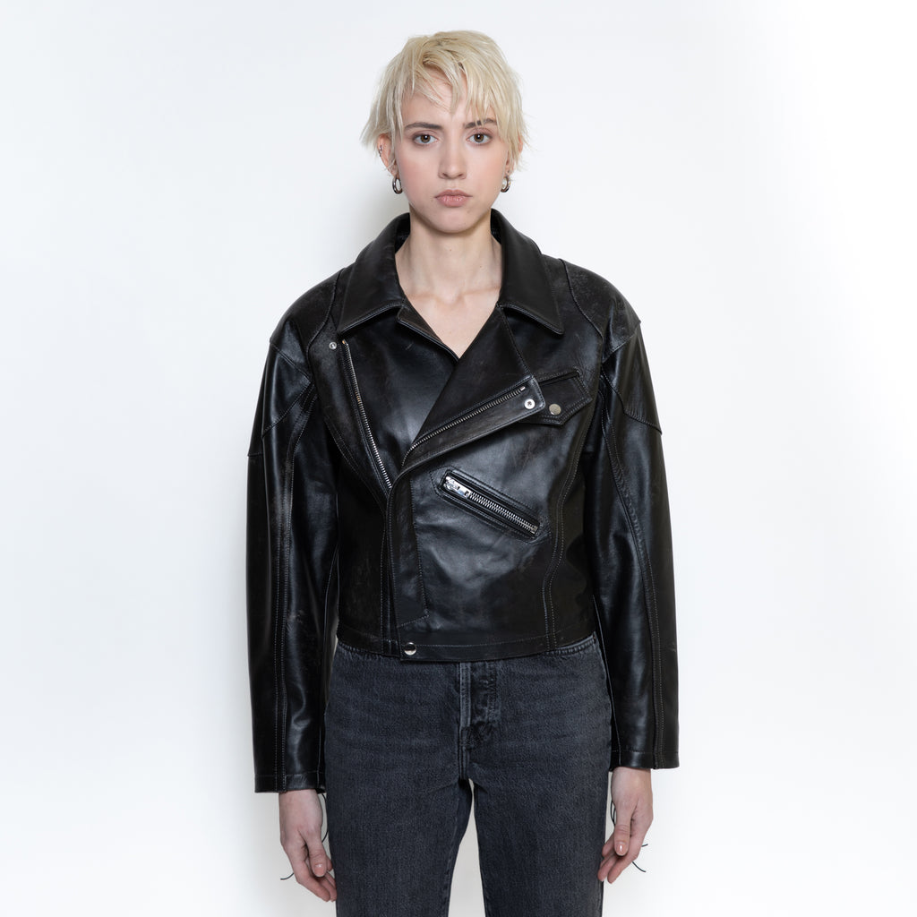 Alanis black double-breasted biker jacket with a light padding is crafted from leather with handmade worked-on details. The vintage treatment gives it a lived-in look and a glam/rock strong effect. Complete with a zippered closure and side jet pockets. Cut to relaxed fit and regular length.