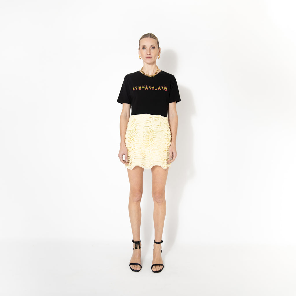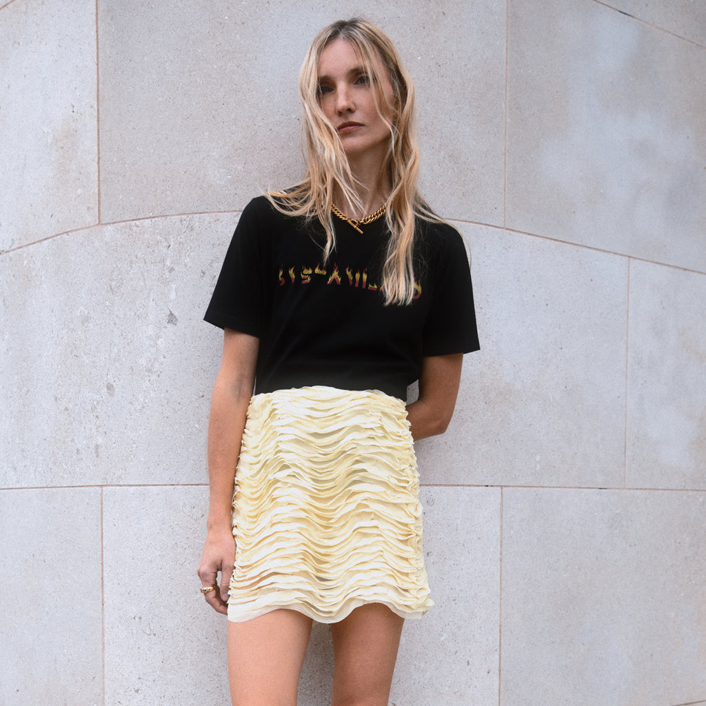 The piece is part of Sveta Milano's Limited Edition items, offering a modern take on the House's codes and symbols. This skirt is crafted from crêpe de chine in polyester in light yellow, inspired by springtime reborn of nature. Designed with a high waist, the style reveals a lined construction and is complete with a hidden zip closure
