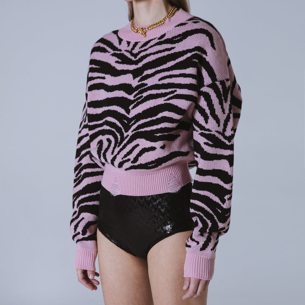 Sveta Milano continues to explore incorporating original design elements into new collections. The emblematic tiger motif is colorfully reinterpreted in this extra-comfy merino wool blend jumper.