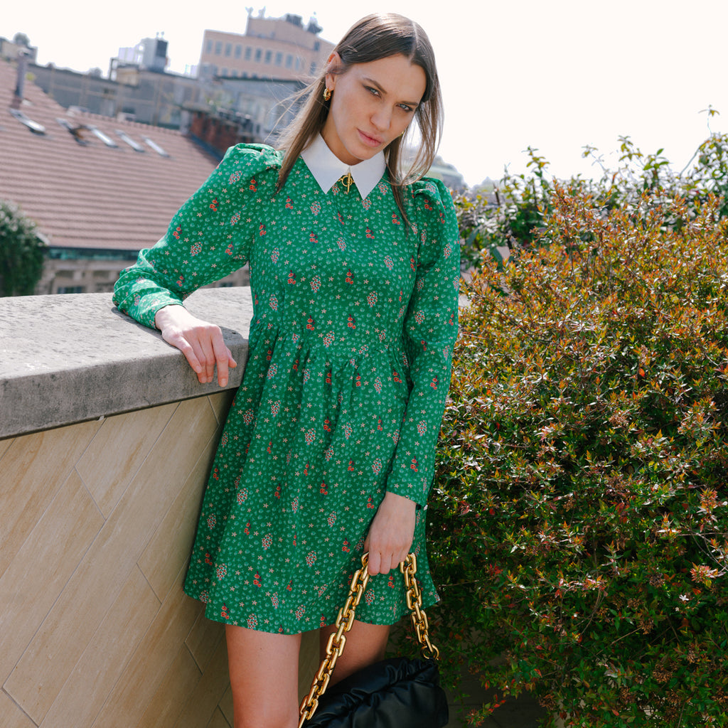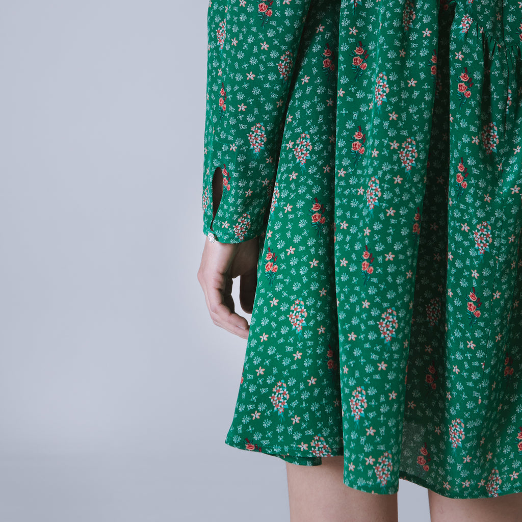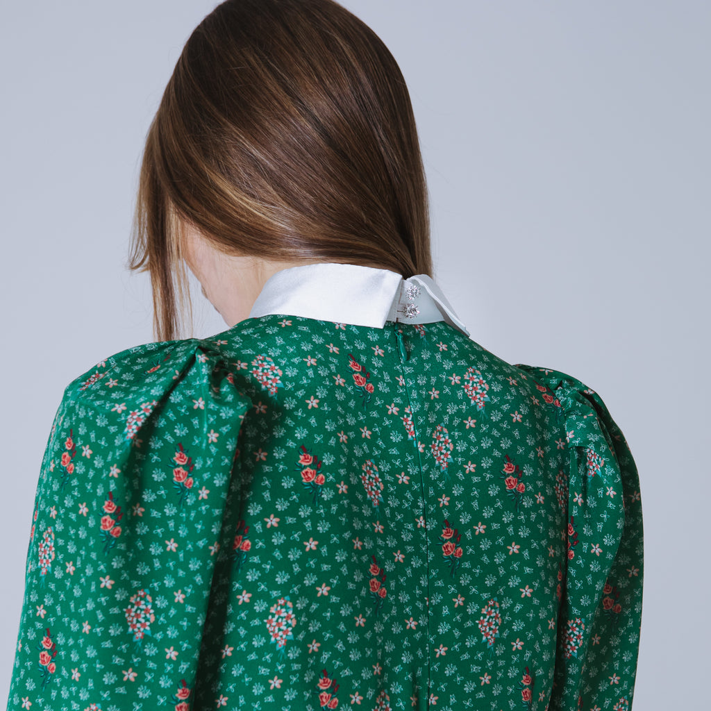 This short long-sleeved dress crafted from silk crêpe de chine shows Sveta's passion for bon ton shapes and preppy details like silk duchess collar. The design is defined by floral pattern. Two jewel buttons on the cuffs and two behind the collar enrich it. Match it with your fave pair of sneakers or heels to be as feminine as grunge.