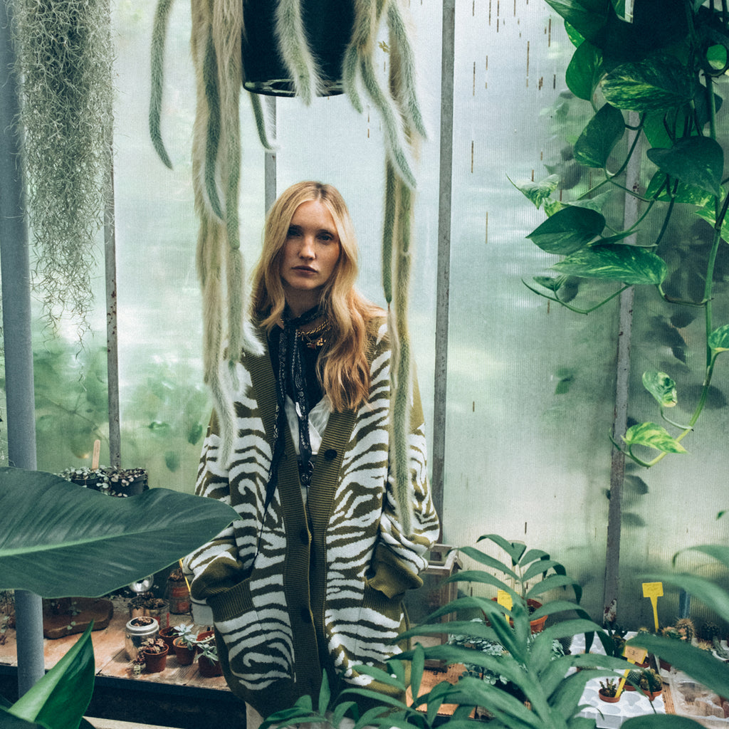 Sveta Milano continues to explore different shapes with new and unexpected juxtaposition color combination. The emblematic tiger motif is up-to-dated in this V-neck cardigan. Amazing to pair with our Ann dévoré white dress.
