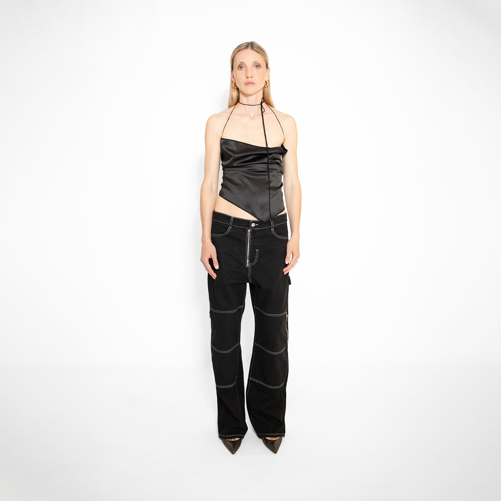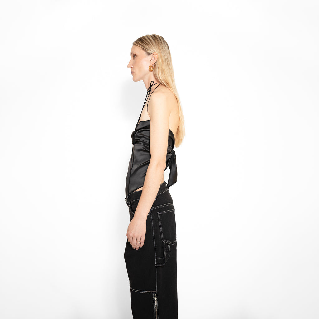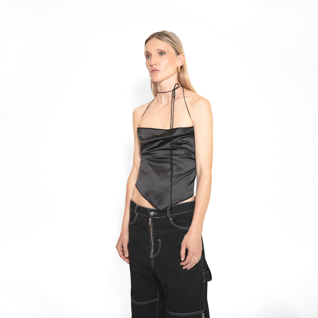 Saint-Tropez foulard top is offering a modern take on the House's codes and symbols. It is crafted from shiny black silk satin, inspired by the French feminine elegance.