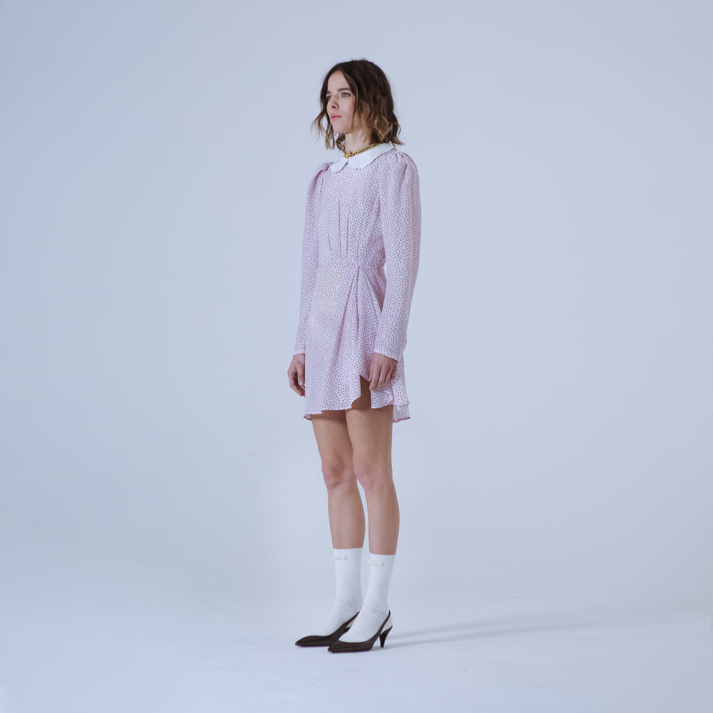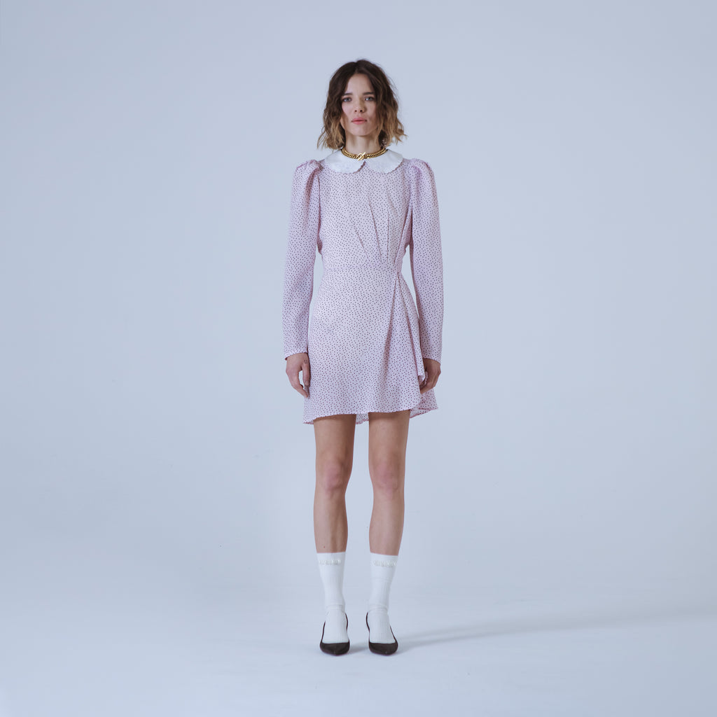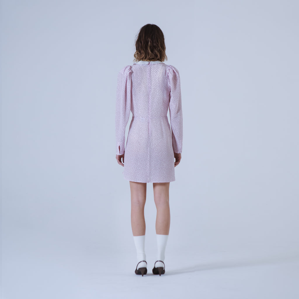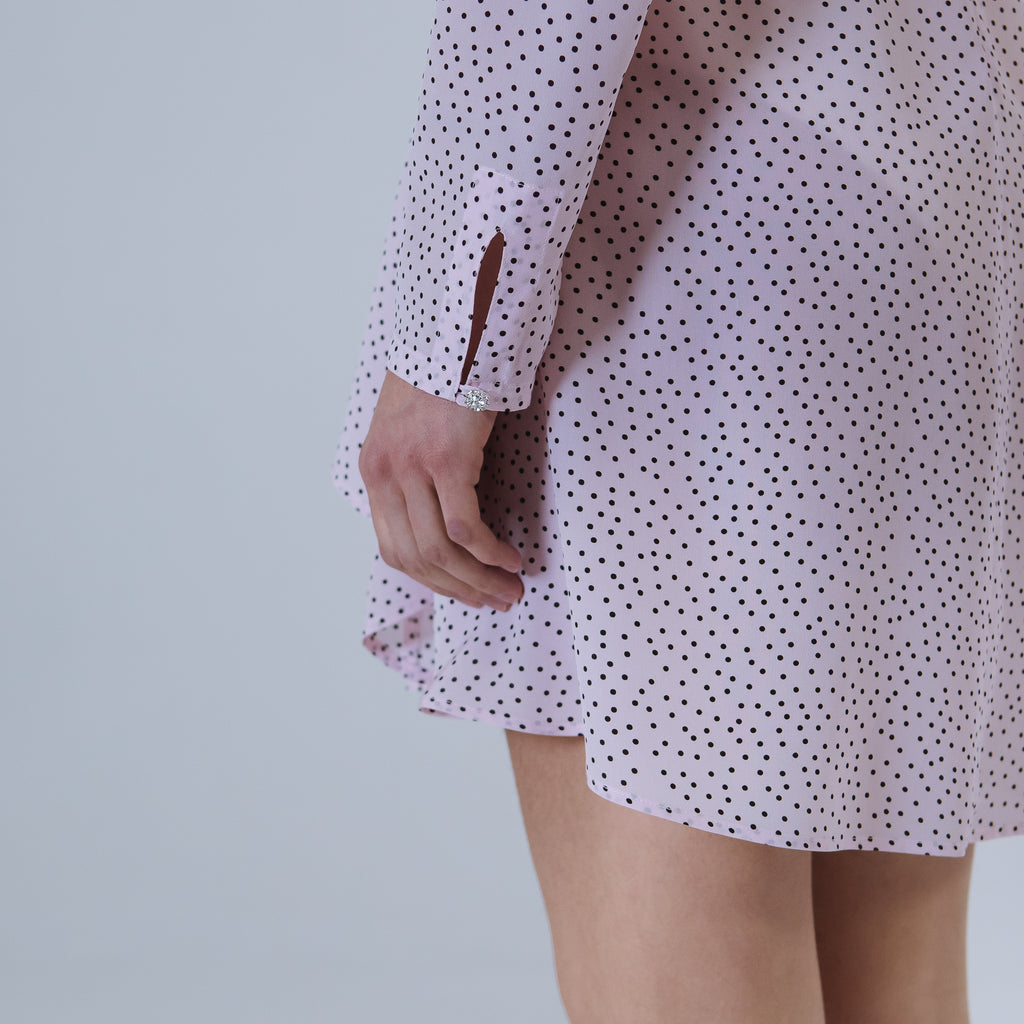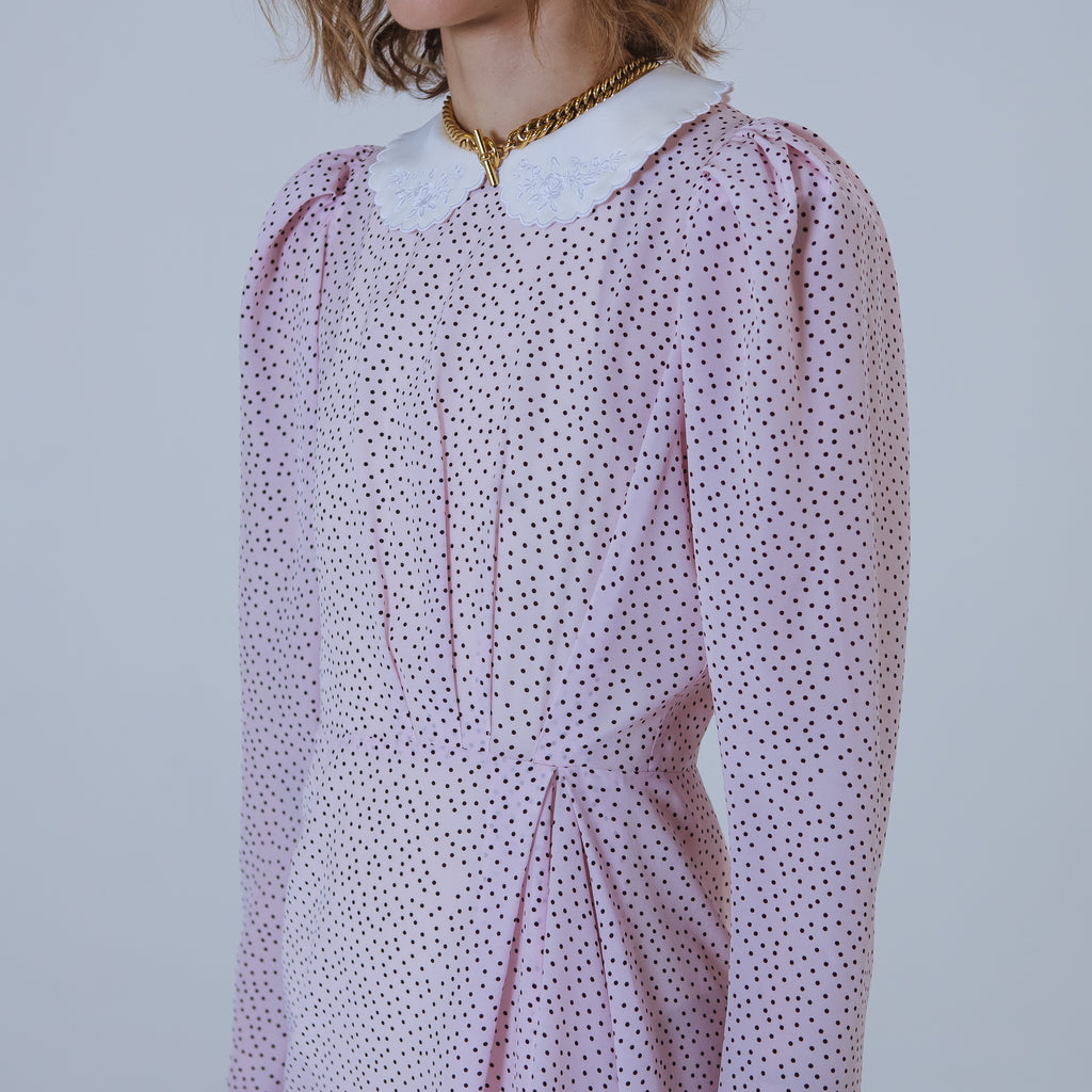 Columbia short dress is inspired from Ivy League girly world. From lunch with friends to a day in the office, our polka-dot dress will ensure that you feel at your most confident. Revisited and reimagined in a silky delicate variation with embroidered silk duchess collar.