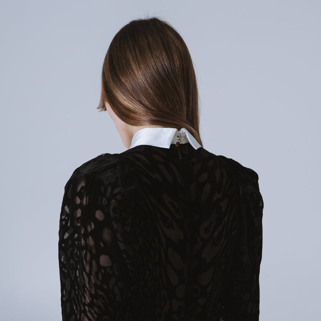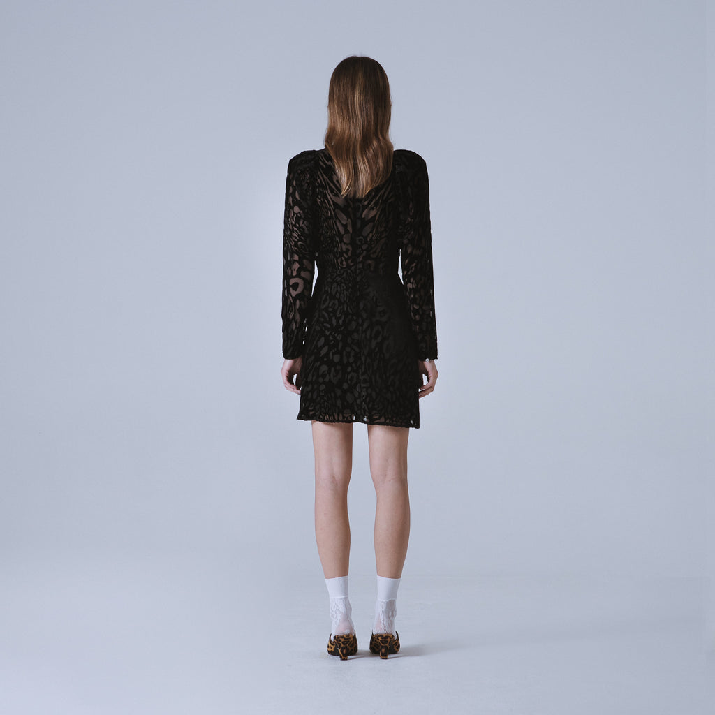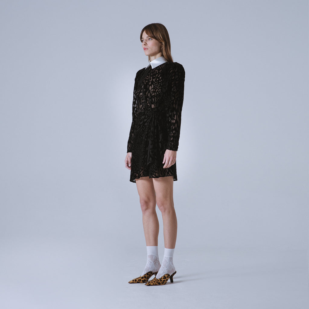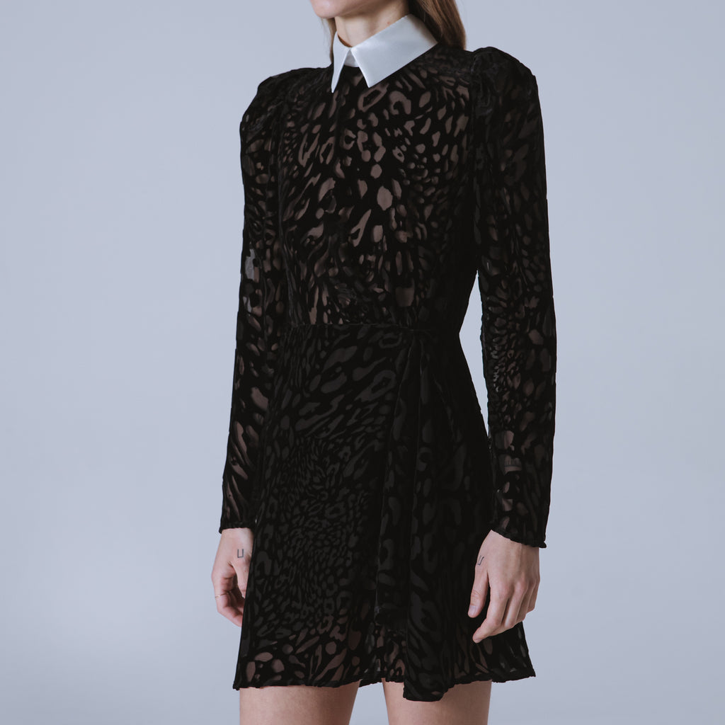 Inspired by the world of the American Ivy Leagues, this dress is crafted from velvet in new leopard pattern and embellished with duchess silk collar and jewel buttons on the cuffs and behind the collar to give it an unparalleled bon ton allure.