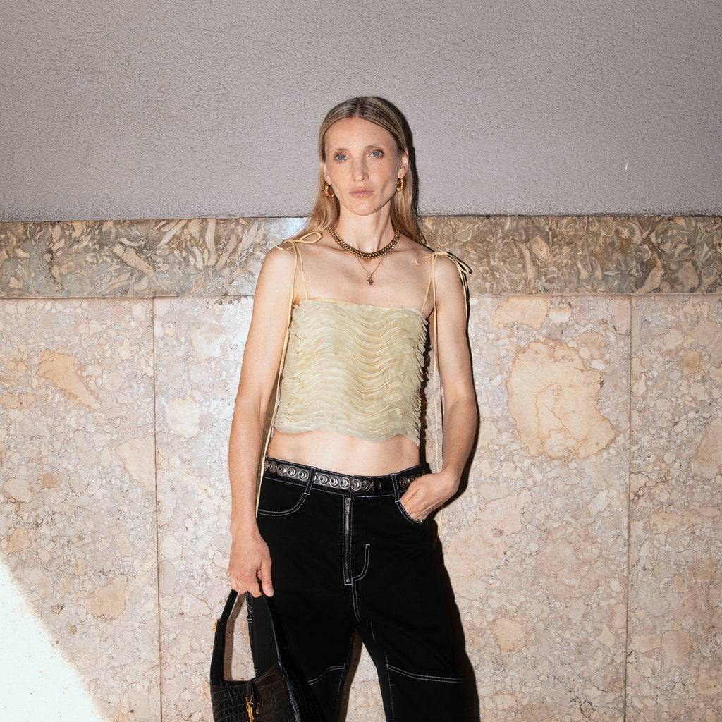 Trinacria top is part of Sveta Milano Limited Edition items, offering a modern take on the House's codes and symbols. It is crafted from upcycled polyester in light yellow with lining in silk crêpe de chine, inspired by springtime reborn of nature.